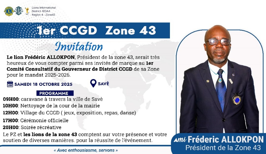 À travers cette invitation officielle, le Président de zone Frédéric Allokpon convie les Lions et amis du mouvement à participer massivement à cette journée. Les organisateurs comptent sur la présence massive et le soutien des membres Lions, partenaires et sympathisants pour faire de cette rencontre un véritable succès.