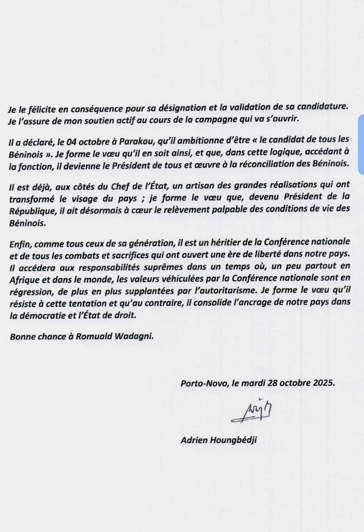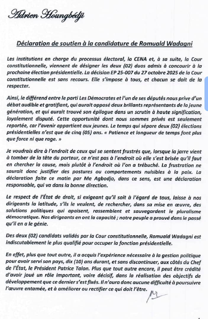 Maître Adrien Houngbédji a réagi au sujet du candidat de la mouvance pour l'élection présidentielle de 2026, au Bénin. Dans une publication faite le 28 octobre 2025, il a apporté son soutien au duo candidat Wadagni-Talata pour la campagne présidentielle à venir. A l'en croire, Romuald Wadagni est indiscutablement le plus qualifié pour occuper la fonction présidentielle ». Voici ci-dessous, l'intégralité de sa déclaration.