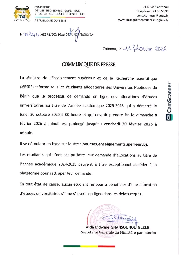 Bonne nouvelle pour les étudiants allocataires des universités publiques du Bénin. Le Ministère de l’Enseignement Supérieur et de la Recherche Scientifique (Mesrs), vient de proroger la date pour les demandes d'allocations en ligne jusqu'au 20 février prochain. C'est à travers un communiqué signé le 11 février 2026, par la ministre Eléonore Yayi Ladékan. Voici ci-dessous, la substance de ce communiqué.