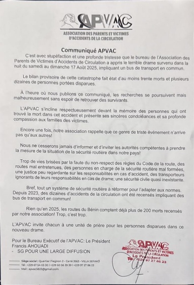 L'Association des Parents et Victimes d'Accidents de Circulation (Apvac) est affectée par l'accident mortel de bus survenu à la hauteur du pont de Thio la nuit du samedi 16 au dimanche 17 août 2025. Après ce drame routier qui a fait une trentaine de morts, 9 rescapés et une dizaine de disparus, l'Apvac a exprimé sa compassion aux familles des victimes tout en invitant les usagers de la route au respect du code routier. C'est à travers un communiqué signé du président de l'association Francis Ahouadi. Voici l'intégralité du communiqué.