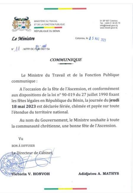 À l’occasion de la célébration de la fête chrétienne de l’Ascension, la ministre du travail et de la fonction publique Adidjatou A. Mathys a déclaré la journée du jeudi 18 mai 2023 fériée chômée et payée. C’est à travers un communiqué en date du 15 mai 2023.