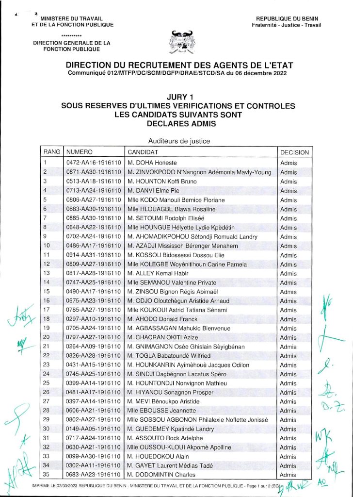 Sur 1 496 candidats qui ont pris part au concours de recrutement des auditeurs de justice, 100 ont été déclarés admis sous réserve d’ultimes vérification et contrôle. La liste a été rendue publique le jeudi 2 mars 2023 par la direction de recrutement des agents de l’État. Retrouvez, ci-jointe la liste des 100 candidats qui ont pu tirer leur épingle du jeu.