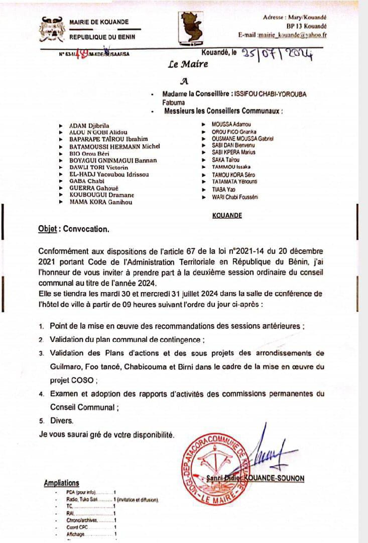 Le conseil communal de Kouandé ouvre le mardi 30 juillet 2024, sa deuxième session ordinaire au titre de cette année 2024. C’est à travers une note en date du 25 juillet 2024 que la première autorité de la commune Didier Kouandé-Sounon a invité ses collègues conseillers à prendre part à cette plénière. Ceci conformément aux dispositions de l’article 67 de la loi n°2021-14 du 20 décembre 2021 portant code de l’administration territoriale en République du Bénin.