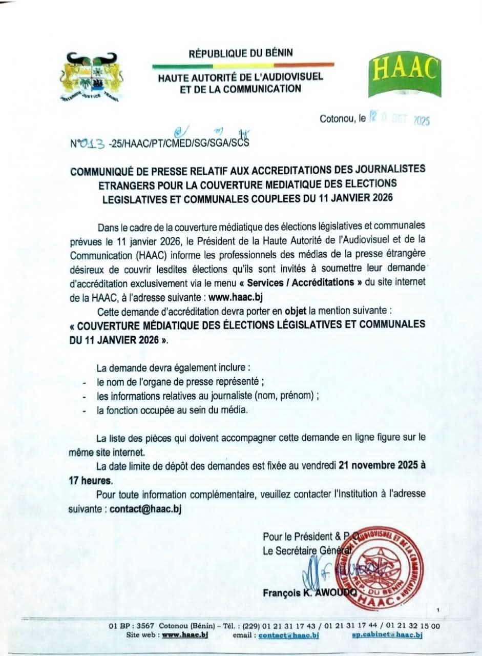 Le 11 janvier 2026, les citoyens béninois seront invités aux urnes afin d'élire les différents maires et les députés du pays. En ce qui concerne la couverture médiatique pour toute la période de campagne, les médias doivent faire preuve d'un certain niveau de professionnalisme en cette période sensible. Pour les médias étrangers la tâche est encore plus complexe. C'est pourquoi à travers un récent communiqué, la Haac a fixé les conditions de couverture des élections prochaines aux médias étrangers. Lisez l'intégralité de la note.