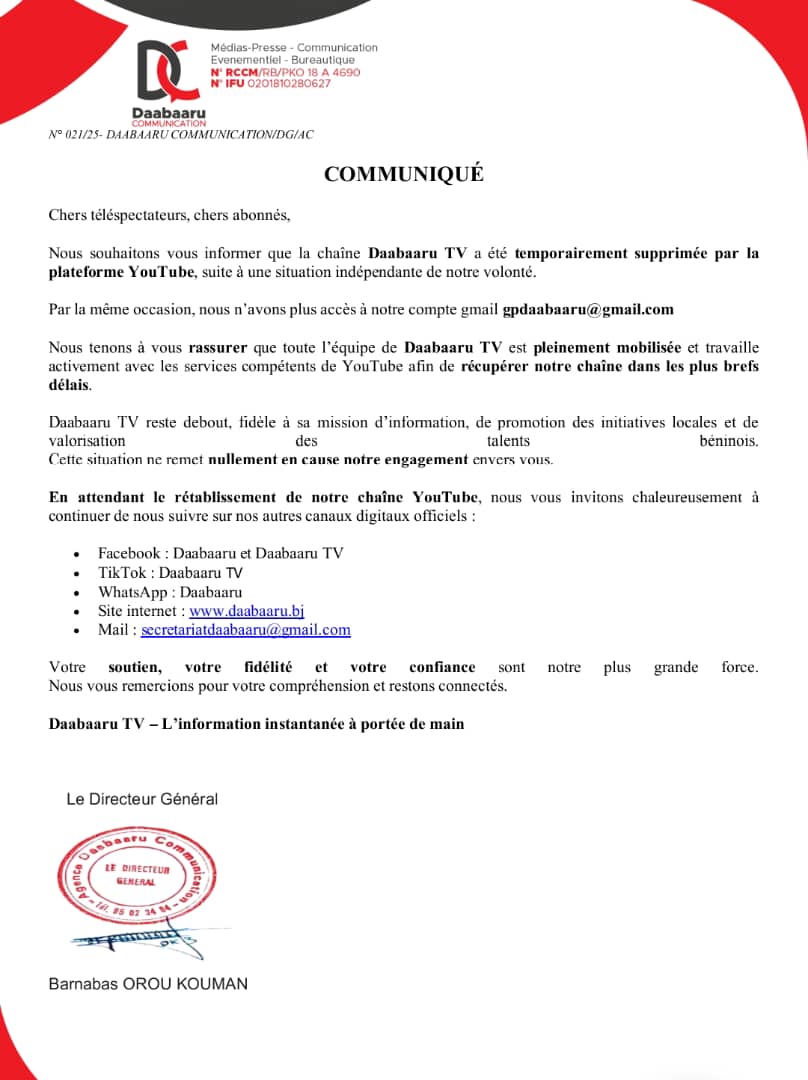 La chaîne de télévision numérique Daabaaru TV a été temporairement supprimée par la plateforme YouTube, suite à une situation indépendante de notre volonté. De même, la direction n'a plus accès au compte gmail gpdaabaaru@gmail.com. Face à ce dysfonctionnement, une équipe travaille activement avec les services compétents de YouTube afin de récupérer Daabaaru Tv dans les plus brefs délais. Voici ci-dessous, le communiqué de la direction générale signé par Barnabas Orou Kouman.