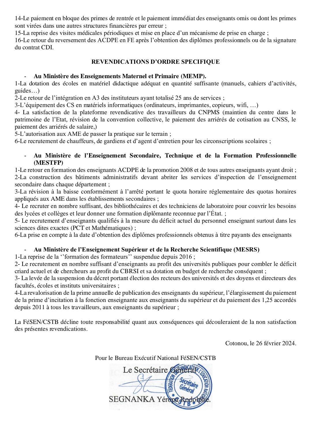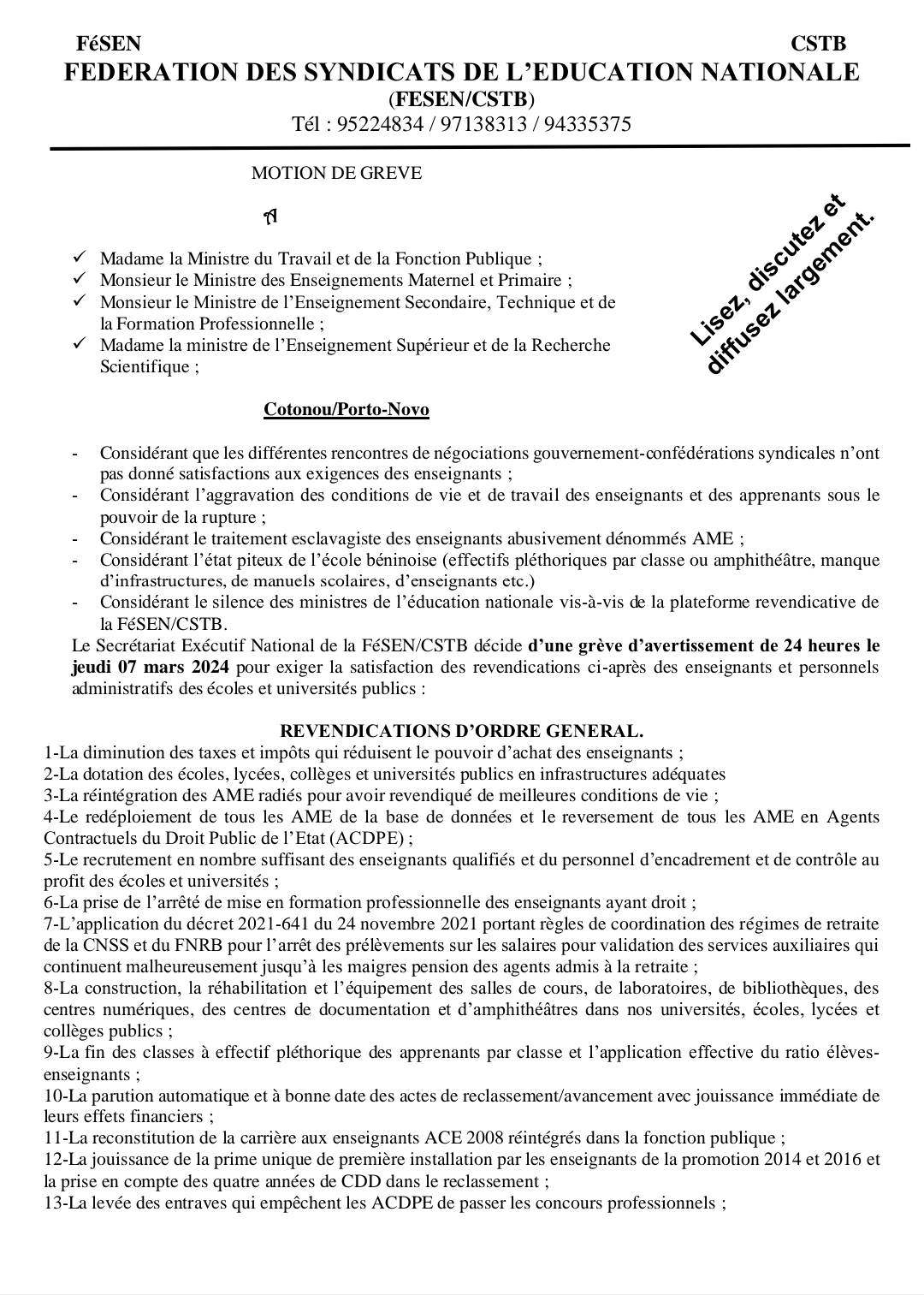 La Fédération des Syndicats de l’Education Nationale (Fésen) de la Confédération Syndicale des Travailleurs du Bénin (Cstb) annonce une grève de 24 heures le 7 mars prochain. C’est à travers une motion de grève signée par le Secrétaire Général (Sg) de la Fésen/Cstb Rodolphe Segnanka en date du 26 février 2024 et adressée aux ministres des trois ordres de l’enseignement ainsi que celui du travail et de la fonction publique. Dans cette motion, la Fésen/Cstb réclame l’amélioration des conditions de vie et de travail des Aspirants aux Métiers d’Enseignants (Ame), des enseignants des trois ordres de l’enseignement, des Agents Contractuels de Droit Public de l’Etat (Acdpe), le recrutement d’enseignants qualifiés et bien d’autres. Voici l’intégralité de leur motion.