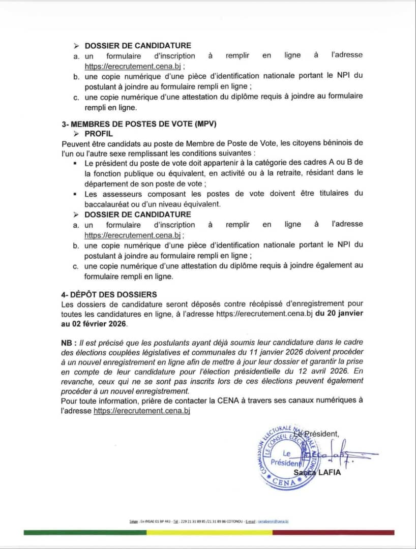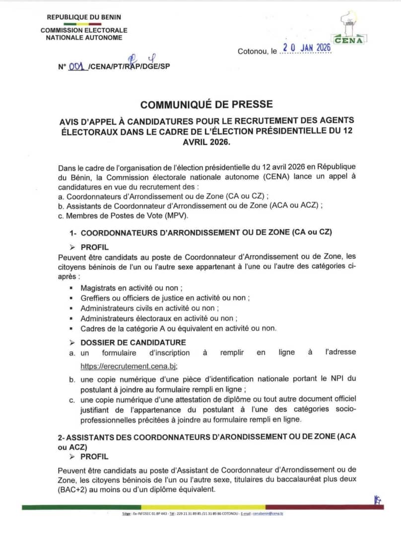 Dans un communiqué rendu public ce mardi 20 janvier 2026, la Commission Électorale Nationale Autonome (Cena) lance le recrutement des Coordonnateurs d'Arrondissement ou de Zone, d’Assistants de Coordonnateur d'Arrondissement ou de Zone et des membres de Postes de Vote. Les dossiers de candidature seront déposés contre récépissé d'enregistrement pour toutes les candidatures en ligne, à l'adresse web de la Céna, https://erecrutement.cena.bj du 20 janvier au 02 février 2026. Lisez ci-dessous, le communiqué qui détaille les conditions à remplir.