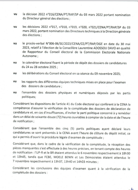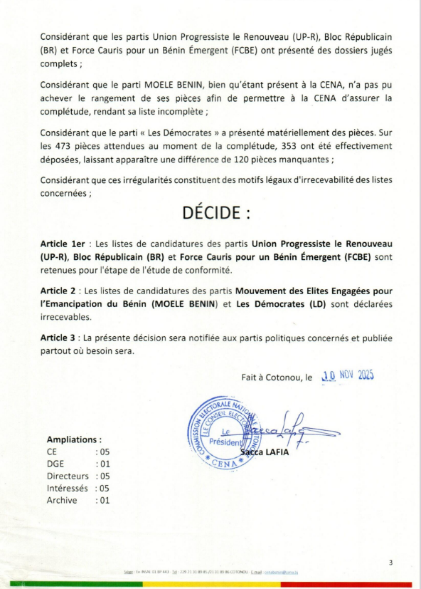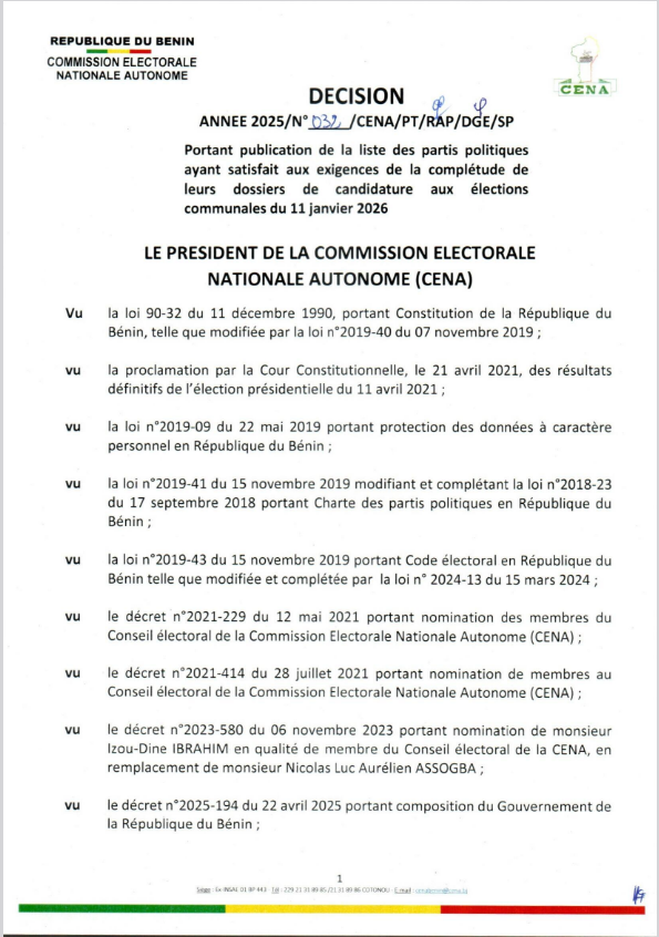 La Commission Électorale Nationale Autonome (Cena) a publié ce lundi 10 novembre 2025, les liste des partis politiques pour examen de la complétude aux élections communales de janvier 2026 au Bénin. Ainsi, les listes des partis Les Démocrates (Ld) et Moele-Bénin sont décorées irrecevables. Quant aux partis Up le Renouveau, Br et Fcbe, ils sont retenus pour la suite du processus. Voici ci-dessous, l'intégralité de la décision.