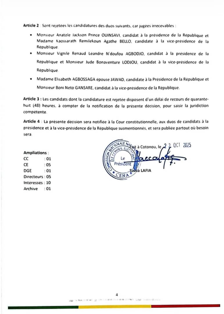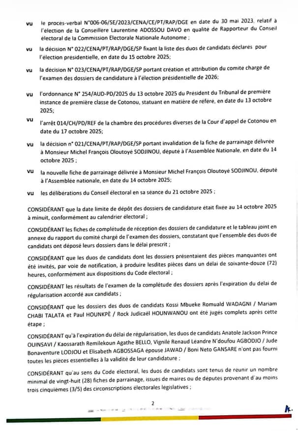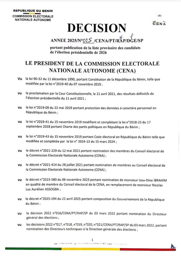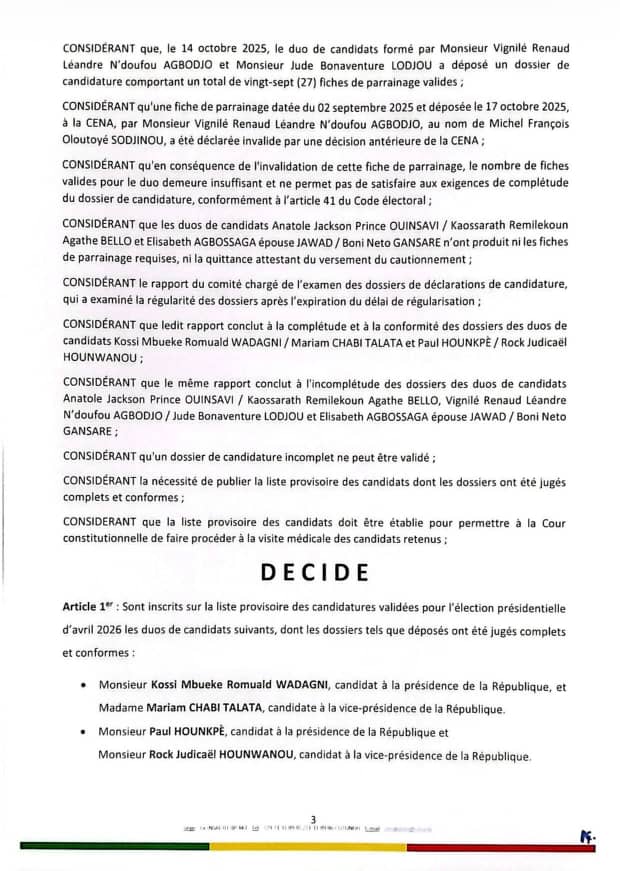 La scène politique béninoise continue de faire couler tant d'encre et de salive. Après étude des dossiers de candidature pour les présidentielles de 2026, la Commission Électorale Nationale Autonome (Cena) a provisoirement annoncé les 2 candidatures validées ce mercredi 22 octobre 2025. Il s'agit du duo Wadagni-Talata et Hounkpè-Hounwanou. Quant aux autres rejetés, ils ont jusqu'au vendredi 24 octobre pour compléter leur dossier. L'entièreté de la note est à lire ci-dessous.