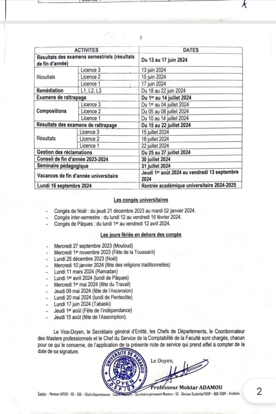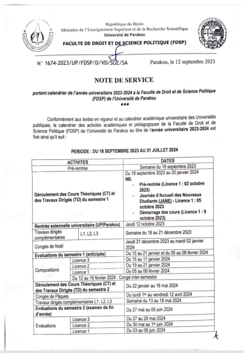 L’on connaît désormais le calendrier de l’année universitaire 2023-2024 de la Faculté de Droit et de Science Politique (Fdsp) de l’Université de Parakou (Up). Les activités académiques et pédagogiques vont se dérouler du 18 septembre 2023 au 31 juillet 2024. Voici l’intégralité de ce calendrier rendu public à travers une note de service signée par le Doyen de la Fdsp de l’Up Professeur Moktar Adamou le 12 septembre 2023.