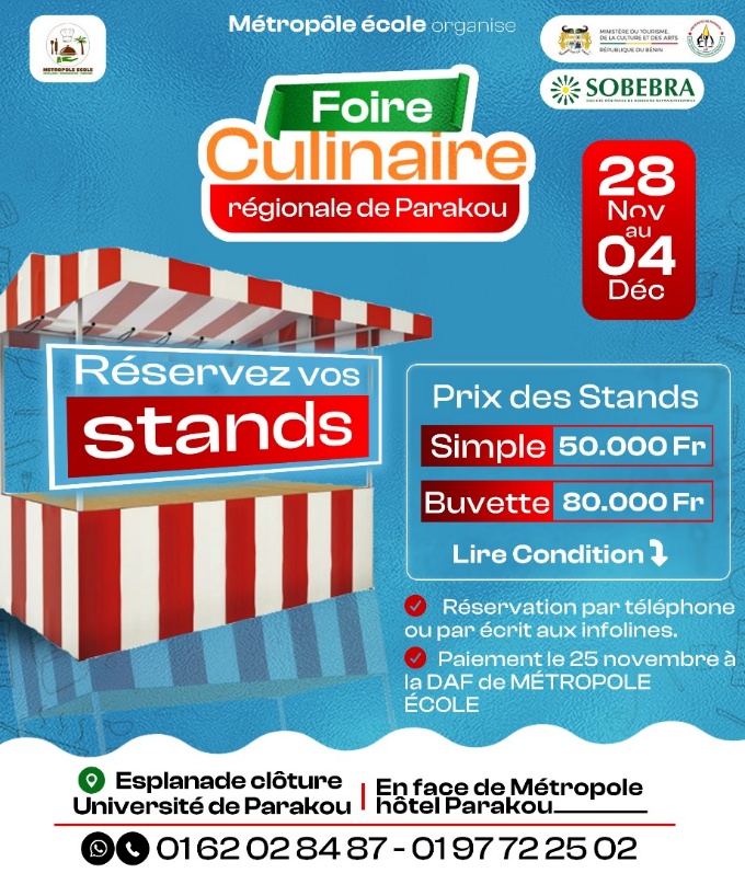 Du 28 novembre au 4 décembre, l’esplanade de la clôture de l'Université de Parakou (Up), accueillera la première édition de la foire culinaire régionale de Parakou. Placée sous le thème « Valorisons nos saveurs béninoises », cette foire vise à offrir un cadre d'exposition et de dégustation des mets traditionnels. Ainsi, pour cette première édition, plusieurs activités seront au menu. Il s'agit des expositions et dégustations de mets traditionnels, des ateliers de démonstration, des masterclass culinaires, concours du « Meilleur Plat Régional » et « Jeune Talent Cuisinier » et des animations culturelles et musicales pour une ambiance festive et conviviale chaque soir. À cet effet, les prix des stands varient entre 50.000f pour les commerçants et 80.000f pour les bars.