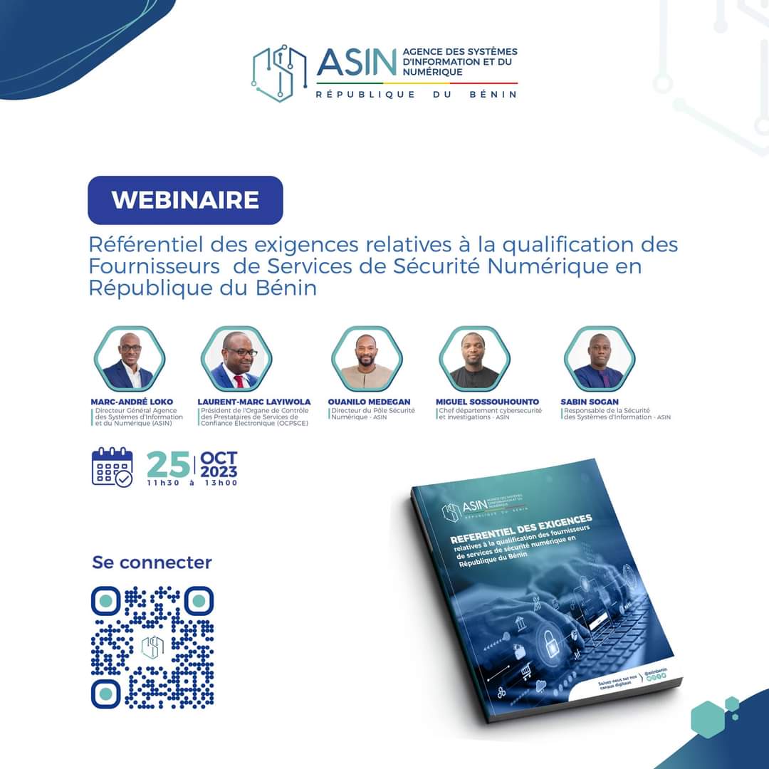L’Agence des Systèmes d’Information et du Numérique (Asin) organise un webinaire ce mercredi 25 octobre 2023 de 11h30 à 13h00. Cette séance s’inscrit dans le cadre de la vulgarisation du référentiel de qualification des Fournisseurs de Services de Sécurité Numérique (Fssn) au Bénin. A cette occasion, l’Organe de Contrôle des Prestataires de Services de Confiance Électronique va ouvrir les demandes à qualification au profit des fournisseurs de sécurité numérique intéressés.
