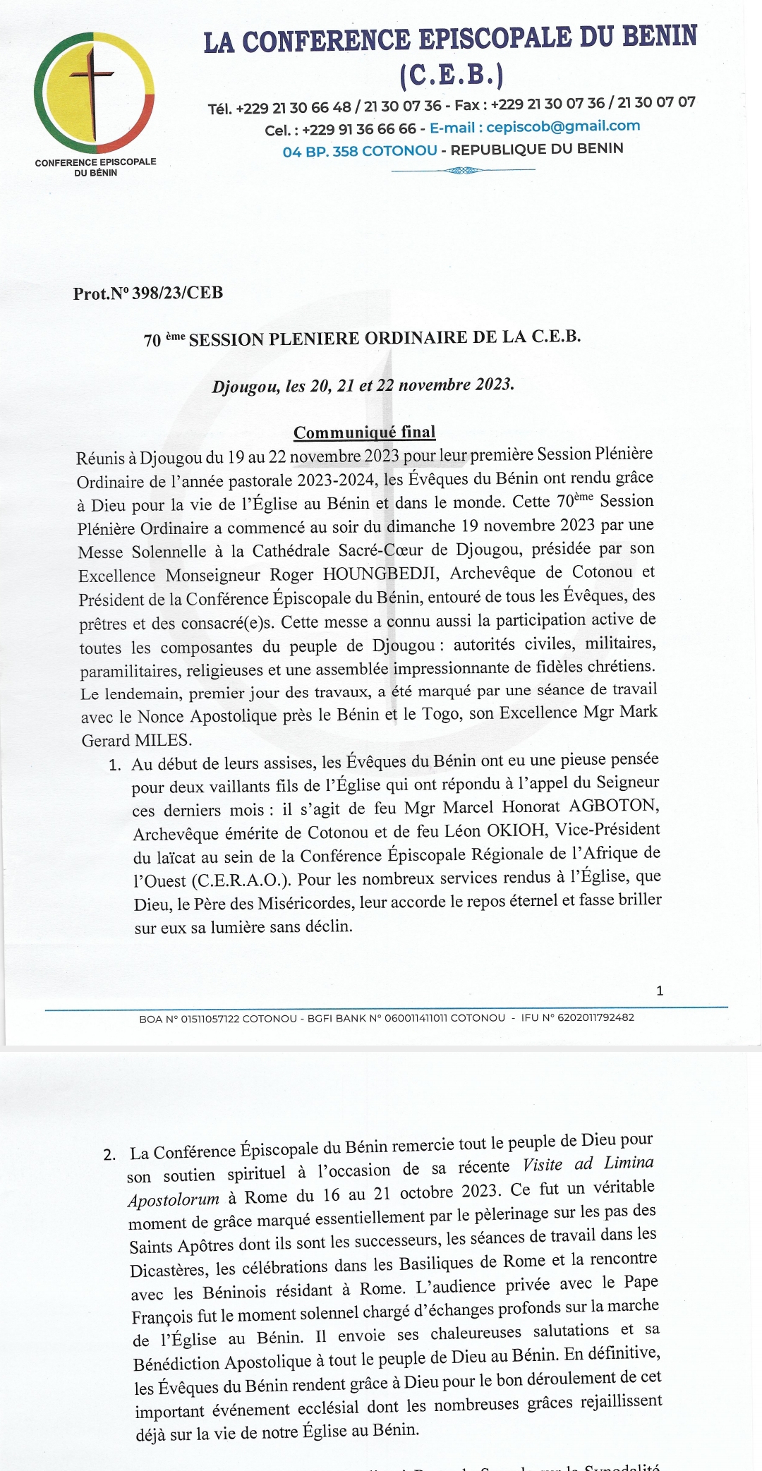 Les évêques du Bénin invitent le gouvernement béninois à prendre davantage des mesures sociales. Ceci pour permettre aux populations de faire face à la flambée des prix des produits de première nécessité. Ils l’ont fait savoir à l’occasion de la session ordinaire de la Conférence Épiscopale du Bénin (Ceb) qui a eu lieu à Djougou du 19 au 22 novembre 2023. Par ailleurs, les évêques ont salué les efforts du gouvernement dans la construction des infrastructures routières, l’éclairage public et les projets de modernisation dans plusieurs domaines.