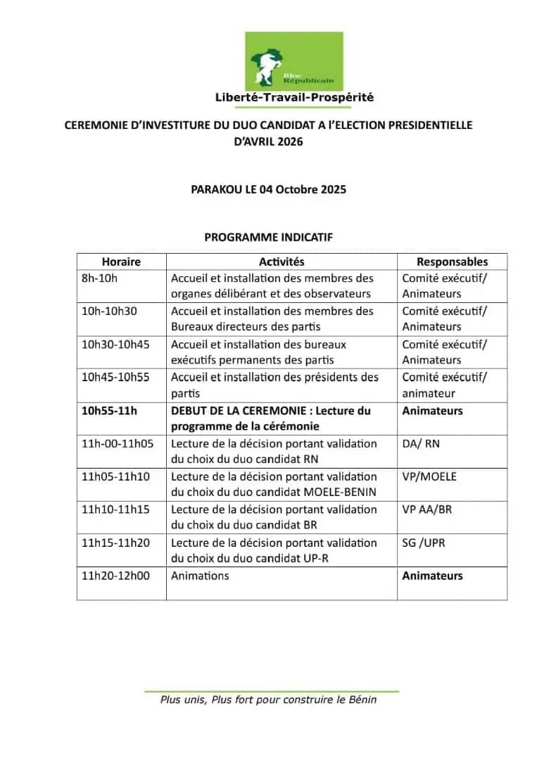 A cet effet, le parti Bloc Républicain (Br) a rendu public le programme indicatif de cet événement d’envergure. Voici ci-dessous, les différentes activités prévues.