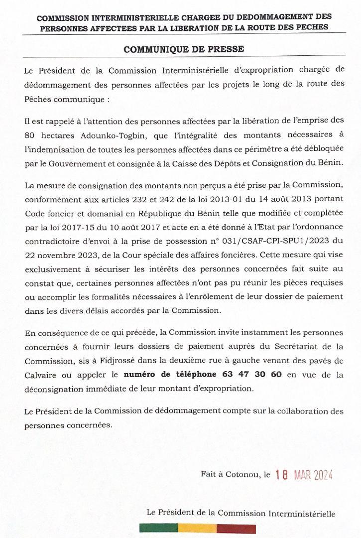 Une nouvelle étape qui sera franchie suite au décaissement par le gouvernement des fonds consignés à la caisse de dépôt et de consignation du Bénin. Le communiqué parle par ailleurs, des conditions à remplir pour bénéficier de ce dédommagement. Voici l’intégralité du communiqué de presse en date du 18 mars 2024.