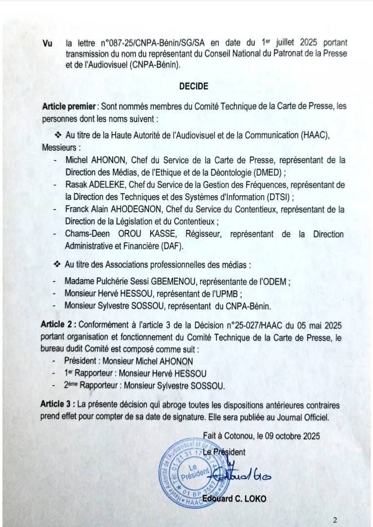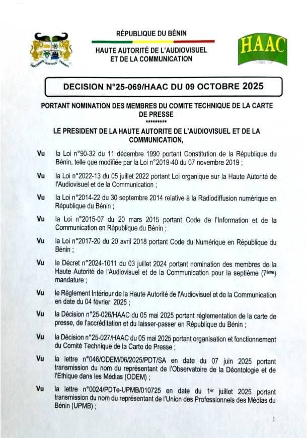 On connaît désormais les membres du Comité technique de la « Carte de presse » au sein de la Haute Autorité de l'Audiovisuel et de la Communication (Haac). Ils ont été nommés par le Président de la Haac à travers une décision en date du 9 octobre 2025. Le bureau dudit comité est présidé par Michel Ahonon, accompagné de deux rapporteurs dont Hervé Hessou et Sylvestre Sossou. Cette nomination vient confirmer la volonté de la Haac à accélérer et assouplir le processus de délivrance de la carte presse au Bénin.