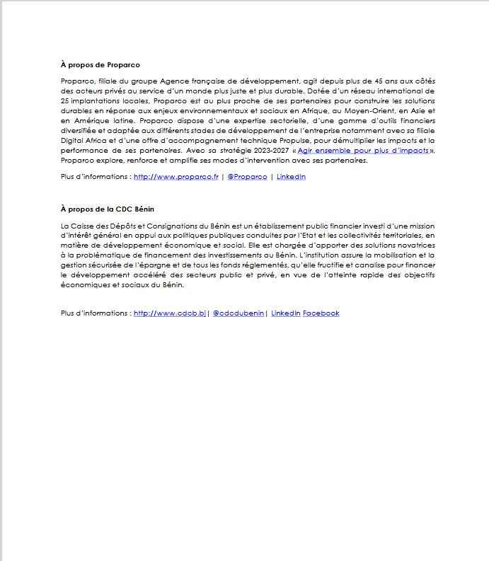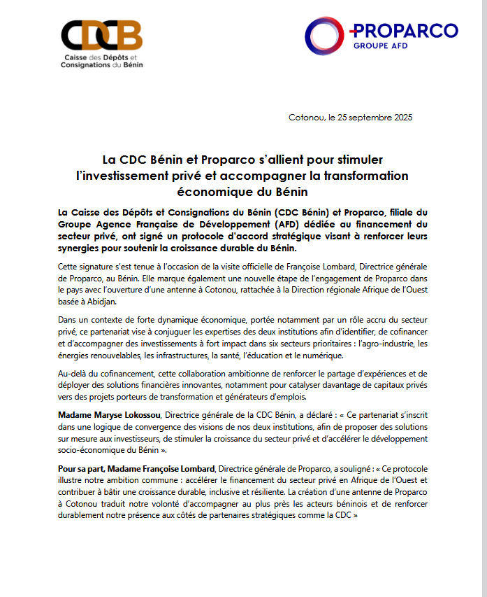 La Caisse des Dépôts et Consignations du Bénin (Cdc Bénin) et Proparco, filiale du Groupe Agence Française de Développement (Afd) dédiée au secteur privé, ont signé un protocole d’accord visant à conjuguer leurs expertises pour stimuler l’investissement, renforcer la création d’emplois et accélérer la croissance durable du Bénin.