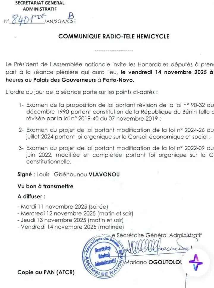 Le Président de l’Assemblée Nationale (An) du Bénin, Louis Gbèhounou Vlavonou convie les Honorables députés à une séance plénière prévue le vendredi 14 novembre 2025 à 10 heures, au Palais des Gouverneurs à Porto-Novo.
