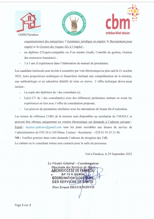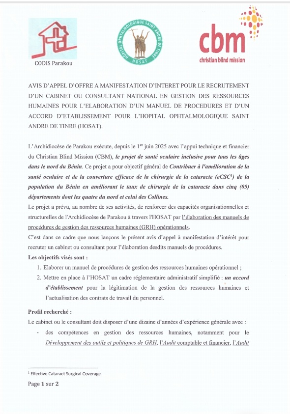 L'archidiocèse de Parakou exécute depuis le 1er juin 2025, avec l'appui technique et financier du Christian Blind Mission (Cbm), le projet de santé oculaire inclusive pour tous les âges dans le nord du Bénin. Dans ce cadre, il est lancé un avis d'appel d'offre à manifestations d'intérêt pour le recrutement d'un cabinet ou consultant national en gestion des ressources humaines pour l'élaboration d'un manuel de procédures et d'un accord d'établissement pour l'Hôpital Ophtalmologique Saint André de Tinré (Hosat). Découvrez à travers cet avis, les conditions à remplir.