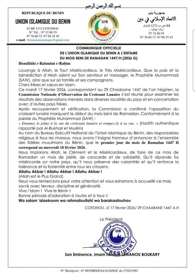 La communauté musulmane du Bénin démarre ce mercredi 18 février 2026, le mois de Ramadan. L'annonce a été faite par l’Union Islamique du Bénin qui a confirmé le mardi 17 février 2026 l’apparition du croissant lunaire, officialisant ainsi le lancement du mois sacré du Ramadan 1447 H dans tout le pays. Le communiqué signé par l’imam Idrissou Lemanou Boukary, a fait savoir que le jeûne débutera ce mercredi 18 février 2026. L’organisation exhorte tous les fidèles à observer ce mois avec ferveur, discipline et générosité, soulignant que le Ramadan est un temps de purification spirituelle, de recueillement et de solidarité envers les plus vulnérables.