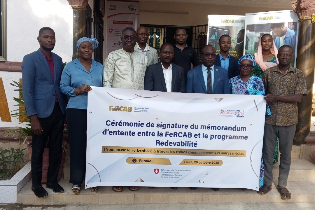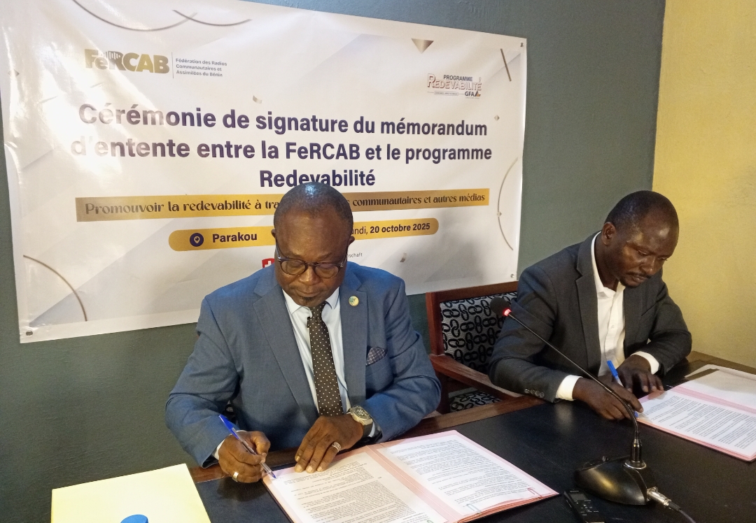 La Fédération des Radios Communautaires et Assimilées du Bénin (Fercab) et le programme Redevabilité de la Coopération Suisse ont signé un mémorandum d'entente. C'était le lundi 20 octobre 2025, au siège de la fédération à Parakou. Ce mémorandum d'entente permettra le renforcement des actions et des interventions entre les deux parties.