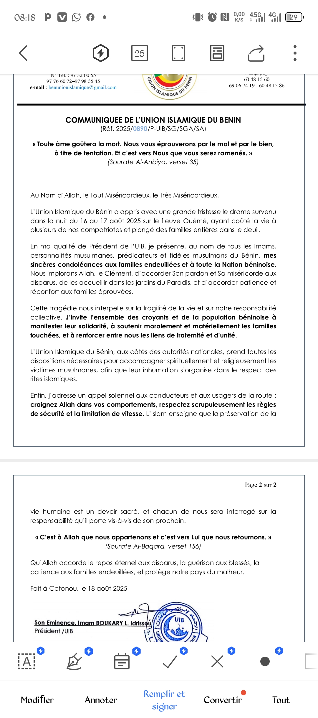 Le président de l'Union Islamique du Bénin (Uib) son Eminence imam Idrissou Boukary a exprimé ses condoléances les plus attristées aux familles éplorées à la suite de l'accident survenu la nuit du 16 au 17 août 2025 sur le fleuve Ouémé. Ce drame qui a coûté la vie à plusieurs personnes a plongé de nombreuses familles dans la douleur et le deuil. Ainsi, c'est à travers un communiqué signé le lundi 18 août 2025, que l'Union Islamique du Bénin (Uib) a profité pour inviter les conducteurs au strict respect des règles de sécurité et de limitation de vitesse. Ci-dessous l'intégralité du communiqué.