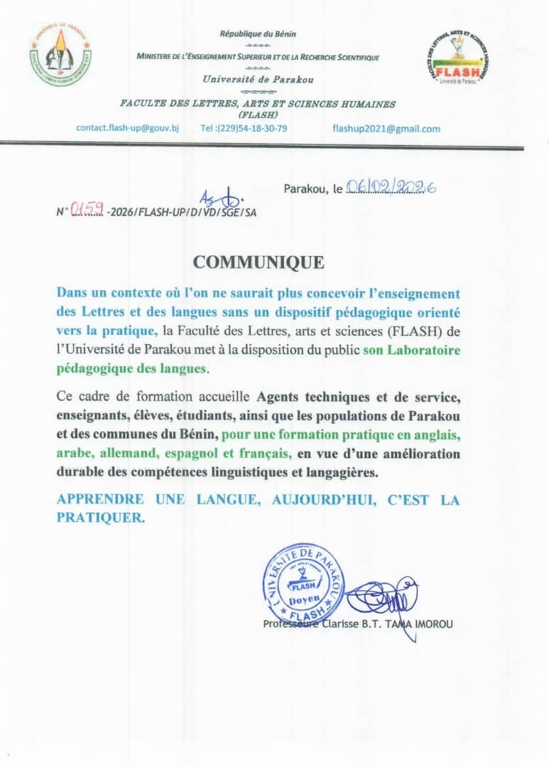 A l'Université de Parakou (Up), la Faculté des Lettres, Arts et Sciences Humaines (Flash) de l’Université de Parakou met à disposition du public son laboratoire pédagogique des langues pour une formation pratique en anglais, arabe, allemand, espagnol et français. Cette formation est ouverte aux étudiants, Agents Techniques et de Service (Ats), enseignants, élèves, commerçants, hommes d'affaires et fonctionnaires. Lisez ci-dessous, le communiqué en date du vendredi 06 février 2026 signé par la Doyenne de la Flash Clarisse Tama Imorou.