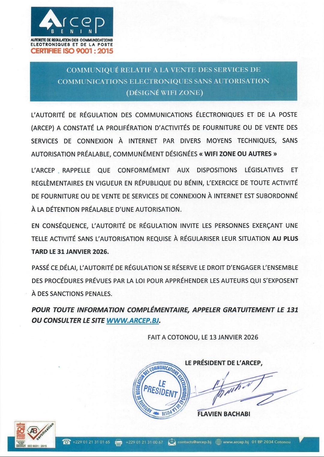 L'Autorité de Régulation des Communications Électroniques et de la Poste (Arcep) va en guerre contre les centres de services de communications électroniques sans autorisation, appelé "Wifi Zone". Dans un communiqué signé le 13 janvier 2026, le Président de l’Arcep Flavien Bachabi a rappelé que conformément aux dispositions législatives et réglementaires en vigueur au Bénin, l’exercice de toute activité de fourniture ou de vente de services de connexion à internet (désigné Wifi Zone) est subordonné à la détention préalable d’une autorisation. Il a, par ailleurs, invité les personnes exerçant une telle activité sans l’autorisation requise à régulariser leur situation au plus tard le 31 janvier 2026. Lisez ci-dessous, l'intégralité de son communiqué.