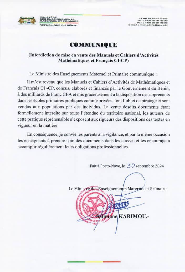Le ministre des Enseignements Maternel et Primaire (Memp) Salimane Karimou informe que la vente des manuels, cahiers d’activités de mathématiques et de français Ci-Cp est toujours interdite sur toute l’étendue du territoire national. Ceci fait suite au constat selon lequel des individus malintentionnés piratent ces documents et les vendent à la population. C’est à travers un communiqué en date du lundi 30 septembre 2024 que ce rappel a été fait par l’autorité ministérielle.