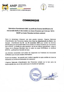 À travers un communiqué, l’Agence Nationale d’Identification des Personnes (Anip) a annoncé l’opération d’enrôlement ciblé au profit des femmes bénéficiaires du microcrédit Alafia et des écoliers en classe d’examen n’ayant pas fait le recensement Ravip. Cette opération qui s’inscrit dans la dynamique d’assurer une plus grande inclusion, permettra de délivrer le certificat Npi/Fid aux bénéficiaires grâce à l’appui de la Banque Mondiale à travers son projet Wuri.
