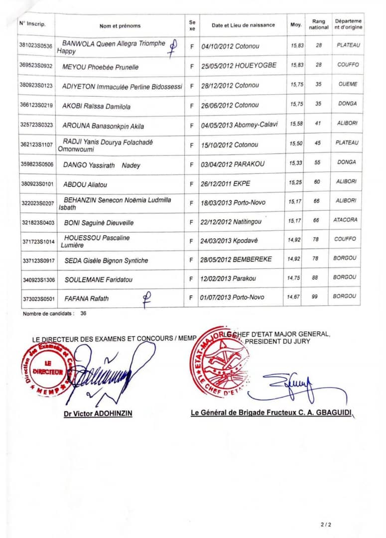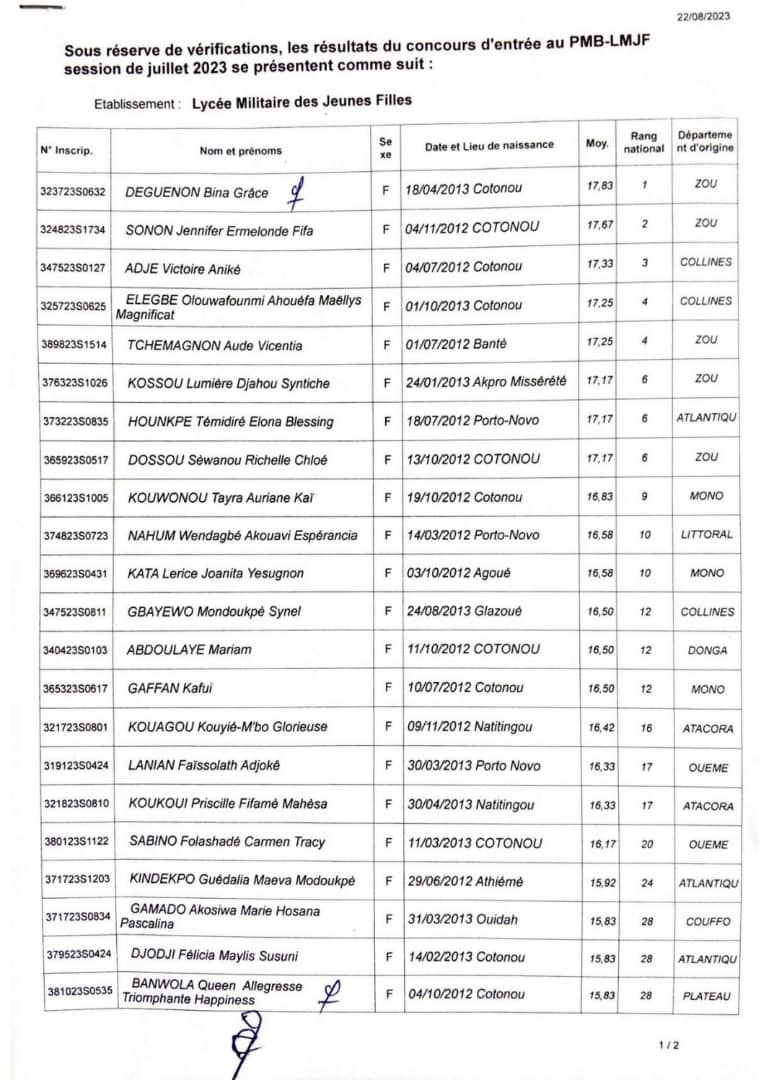 Les résultats du concours d’entrée au Lycée Militaire des Jeunes Filles (Lmjf) de Natitingou et au Prytanée Militaire de Bèmbèrèkè (Pmb) sont disponibles. C’est à travers une note signée par le Directeur des Examens et concours (Dec) Dr Victor Adohinzin et le Chef d’état-major général Le Général de Brigade Fructeux Gbaguidi ce mardi 22 août 2023. Sous réserve de Vérification, voici ci-dessous la liste des candidats sélectionnés.