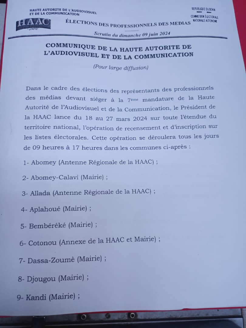 Le processus pour les élections des représentants des professionnels des médias devant siéger à la 7ème mandature de la Haute Autorité de l’Audiovisuel et de la Communication (Haac) suit son cours normal. A cet effet, du 18 au 27 mars 2024, aura lieu sur toute l’étendue du territoire national, l’opération de recensement et d’inscription sur les listes électorales. L’annonce a été faite à travers un communiqué signé par le présent de la Haac Rémi Prosper Moretti. À lire l’intégralité du communiqué ci-dessous.