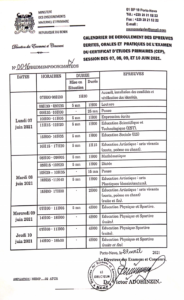 Ainsi, selon cette note, les candidats planchent les épreuves écrites du 7 au 8 juin 2021. Les épreuves de l’Education Physique et Sportives (Eps) sont prévues du 9 au 10 Juin 2021. La correction des copies quant à elle, débute le 21 juin pour prendre fin le 25 juin 2021. Le contrôle et l’intégration des notes sont prévus pour se dérouler du 28 au 29 juin prochain. Par ailleurs, la délibération et la proclamation des résultats auront lieu le 30 juin 2021 et les travaux de finition se tiendront du 2 au 6 juillet 2021.