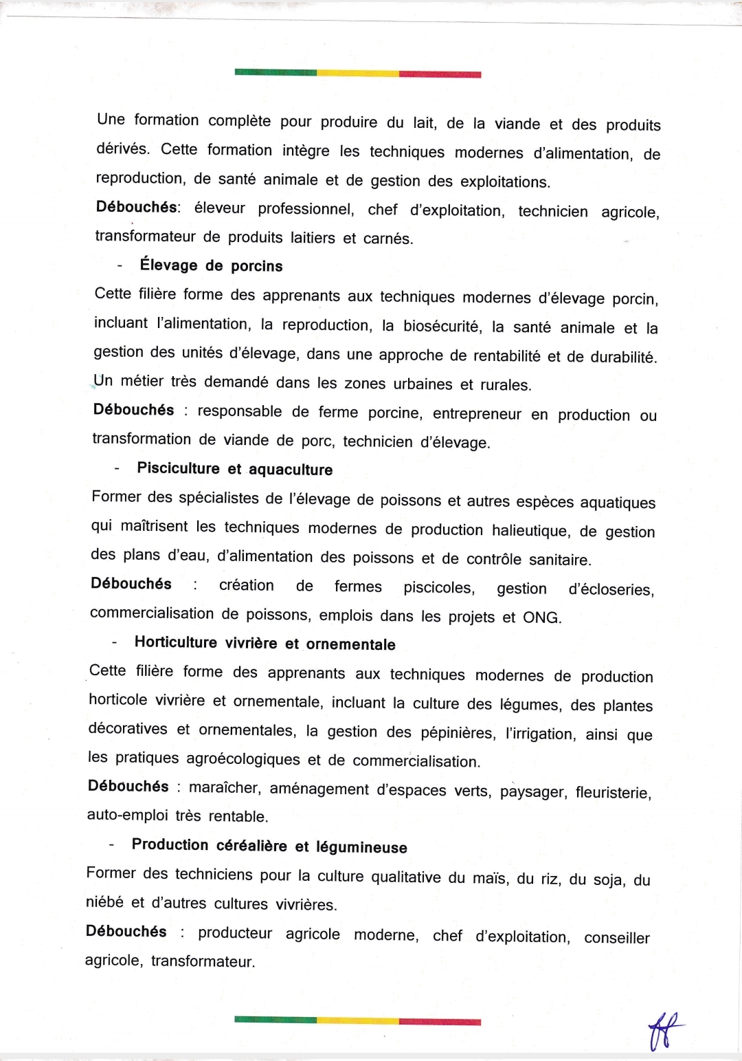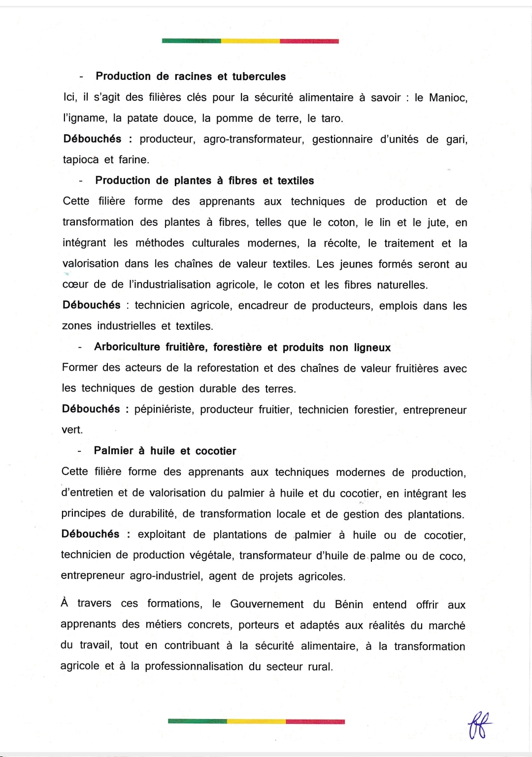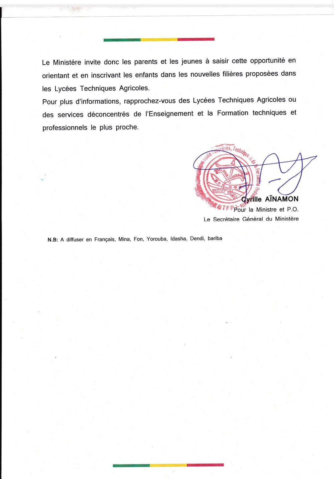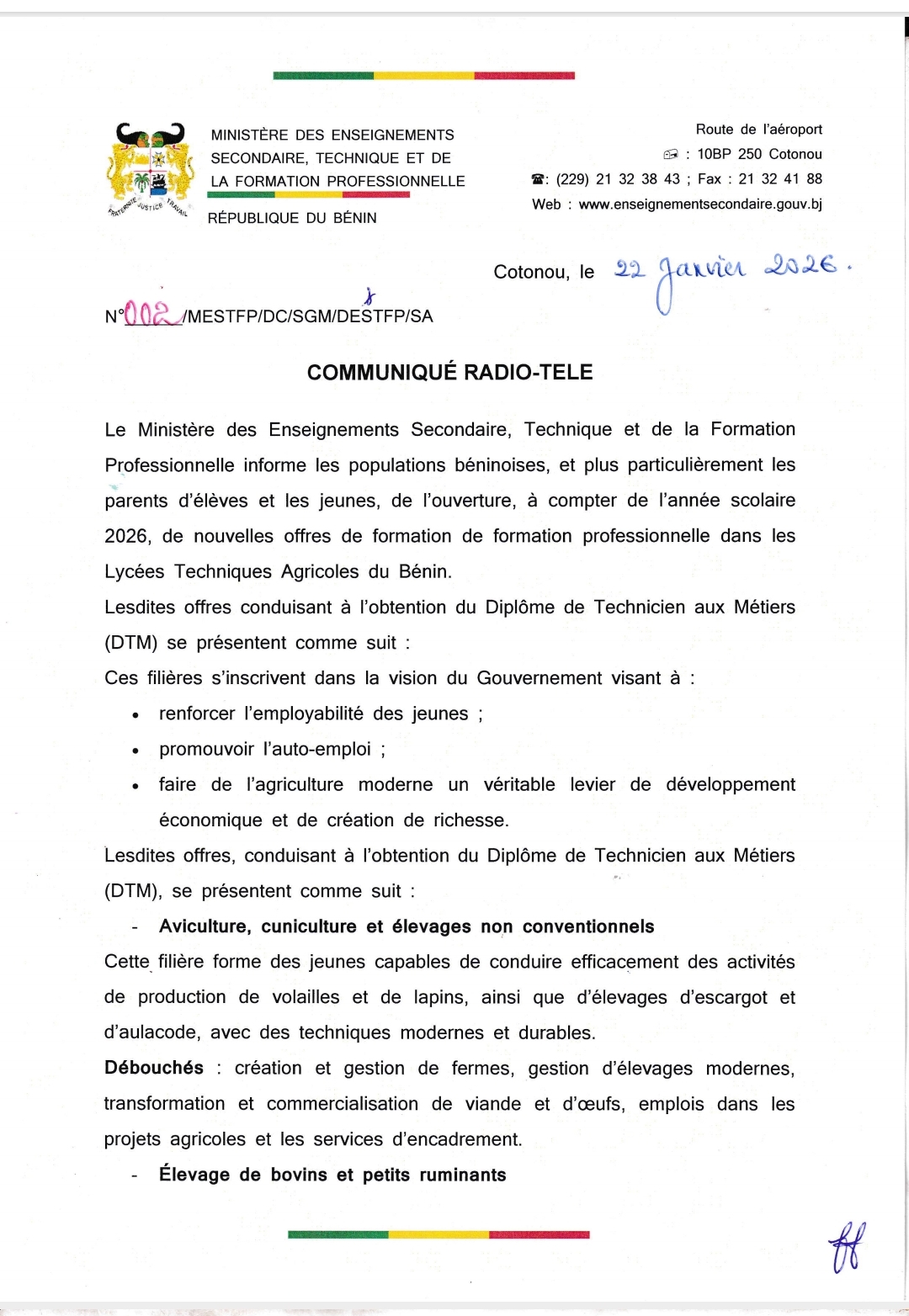 De nouvelles offres de formation professionnelle dans les lycées techniques agricoles du Bénin seront disponibles dès l'année scolaire 2026. Il s'agit des offres conduisant à l'obtention du Diplôme de Technicien aux Métiers (Dtm). Découvrez ci-dessous, le communiqué signé du secrétaire général du ministère des enseignements secondaire, technique et de la formation professionnelle Cyrille Aïnamon en date du 22 janvier 2026.