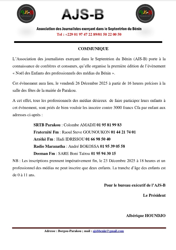 Dans un communiqué signé de son président, Albérique Houndjo, l’Association des Journalistes exerçant dans le Septentrion du Bénin (Ajs-B) annonce l'organisation, le vendredi 26 décembre 2025, de la première édition de l’événement dénommé « Noël des enfants des professionnels des médias du Bénin ». Prévue pour démarrer à 16 heures précises, cette activité festive se tiendra à la salle des fêtes de la mairie de Parakou. Elle vise à offrir aux enfants des professionnels des médias un cadre convivial de réjouissance, de partage et de célébration de la fête de Noël.
