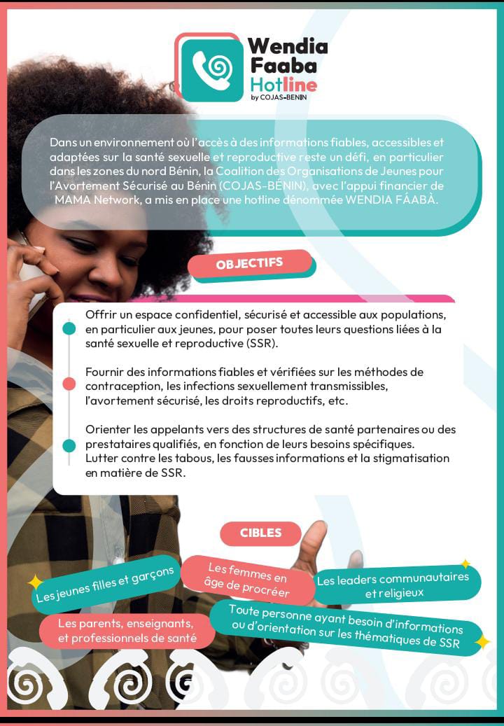 Face aux difficultés d’accès à des informations fiables, accessibles et adaptées sur la Santé Sexuelle et Reproductive (Ssr), notamment dans les zones du nord-Bénin, la Coalition des Organisations de Jeunes pour l’Avortement Sécurisé au Bénin (Cojas-Bénin) a agi. Avec le soutien financier de Mama Network, elle a mis en place une hotline dénommée "Wendia Fáabà".